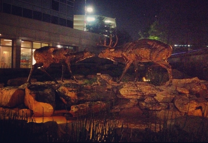 The rain that has plagued us the last few days finally cleared up this evening, so it was a beautiful night for a walk along the water. We happened upon a hot dog stand serving a great casual dinner. We chatted away as we took in all the pretty lights and fountains. I don't know what it is about Gary, but our easy banter made this last minute date feel like I was with someone I've known for years and years. He wasn't afraid to tease or be teased, but was still a gentleman to his core, complete with opening my doors almost 100% consistently all night. The two highlights of our casual stroll, besides the laughter and conversation, were both animal related. One, this statue of two moosen sniffing each other in some sort of mating ritual. (They might have actually been deer, but I prefer moosen, so moosen they shall be).